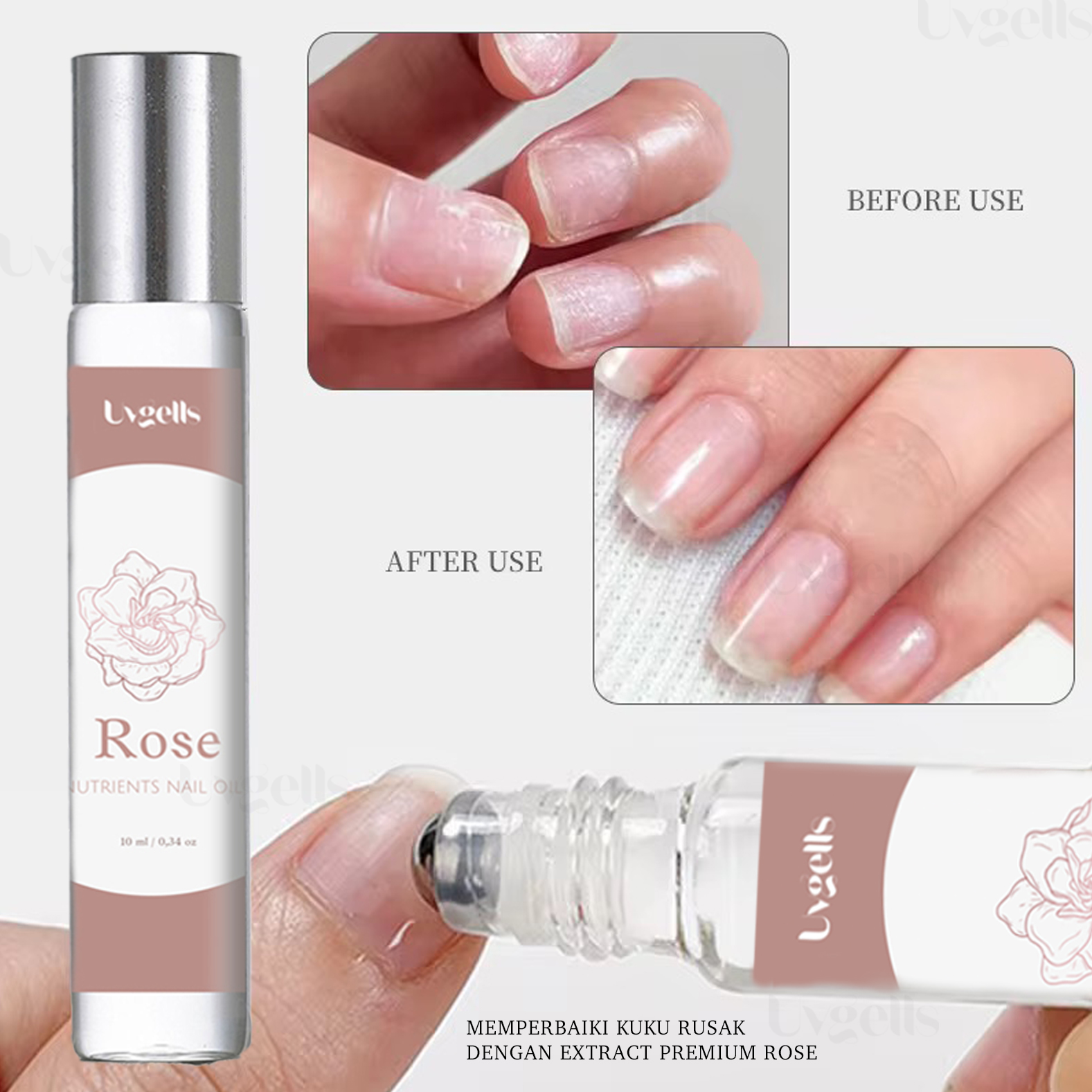 UVGELLS presents Rose Nutrients Nail Oil – a nourishing nail treatment oil infused with premium rose extract, specially formulated to repair, strengthen, and accelerate nail growth. Designed in a practical roll-on form, this oil absorbs quickly into the cuticle area to deliver maximum care from within.
